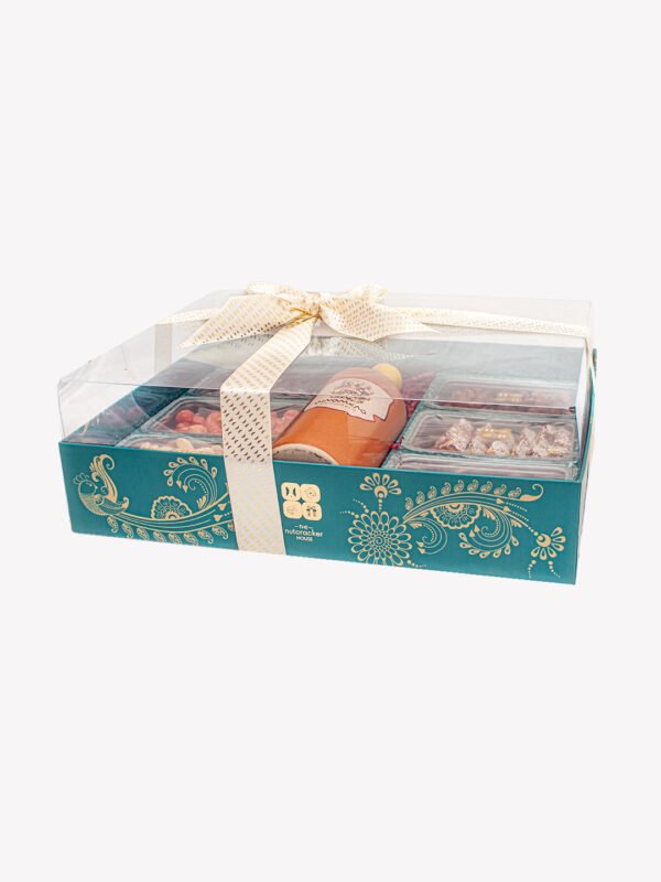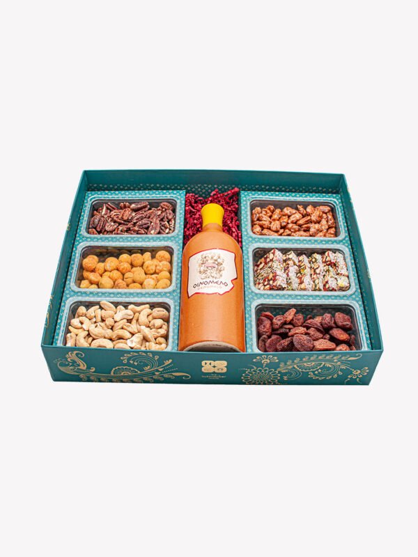 The Collection Box is filled with sweet wine, and delicious sweet and flavored nuts, dried fruits, and pistachio delight