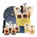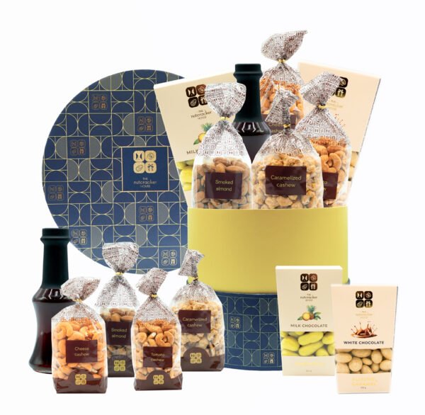 Nice Box includes caramelized and flavored cashews, smoked almonds, milk and white chocolate with fruit and nuts, and Commandaria wine.