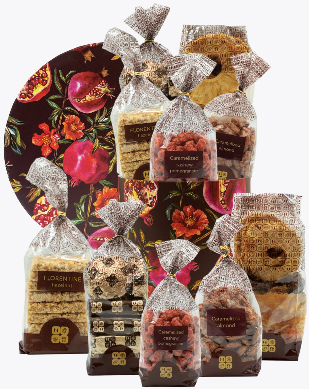 The “Treats” box includes a delectable assortment of Mix Natural Fruits, Mix Gold Chocolate, Caramelized Pomegranate Cashew, Caramelized Almond, and Florentine Hazelnuts, an irresistible selection to indulge in.